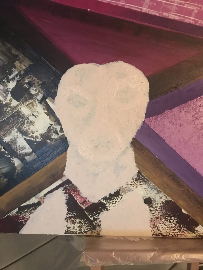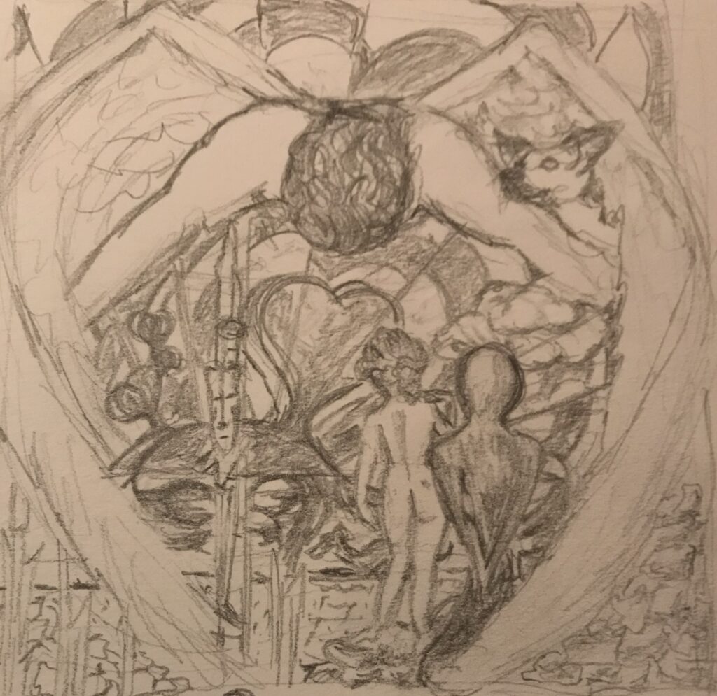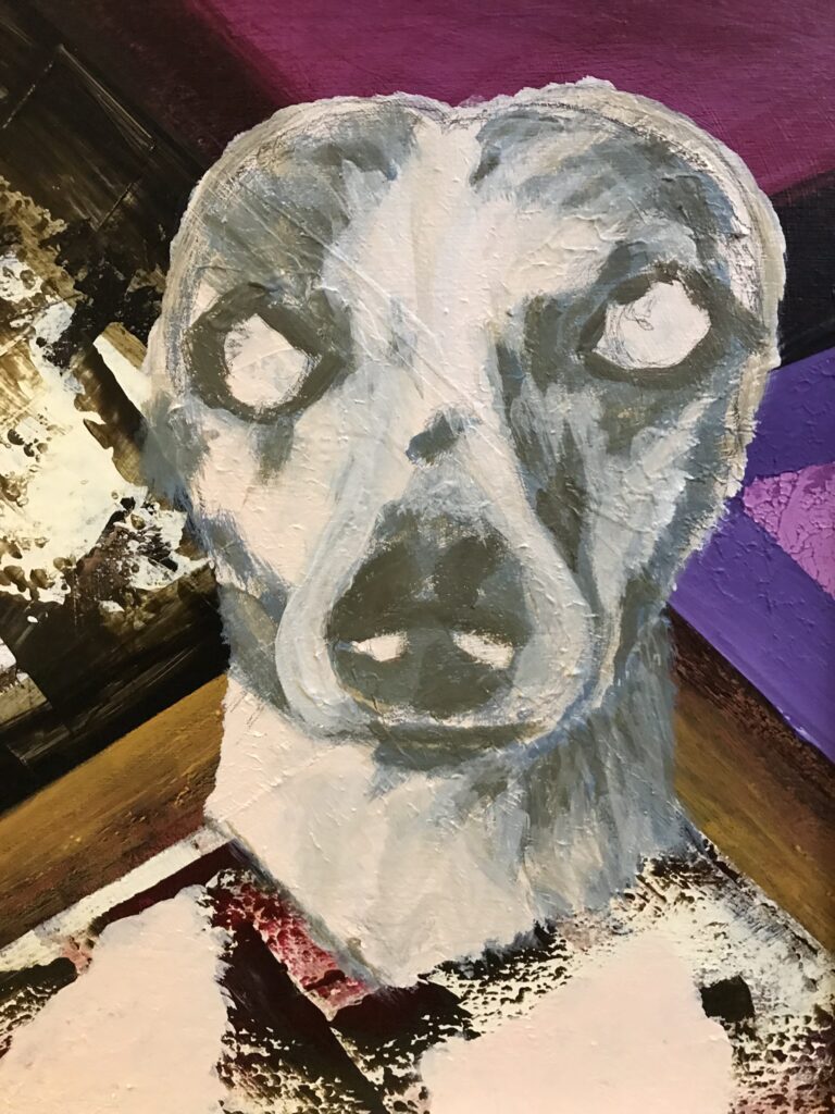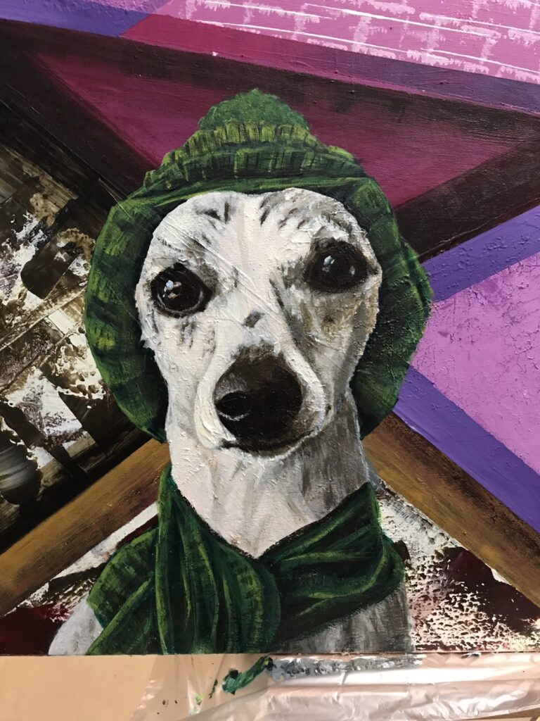 combine all hobbies, lovely dogs, interest and stuff, it should match on a bronze colored wall and must have pink/lila on it… let’s draw: